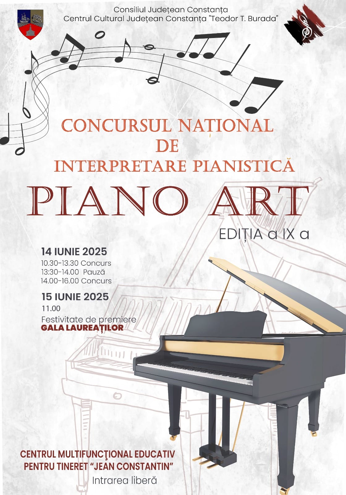 Organizat de Centrul Cultural Județean Constanța „Teodor T. Burada“, cu sprijinul Consiliului Județean Constanța, Concursul „Piano Art“ se va desfășura la Centrul Multifuncțional Educativ pentru Tineret „Jean Constantin“, în perioada 14 – 15 iunie.